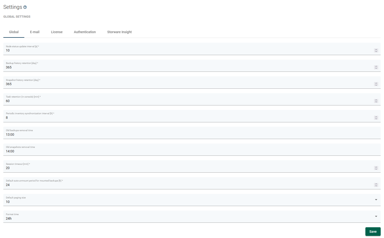 Node status update interval- how often nodes should update their statusBackup history retention- how long should the history of backups be kept (even removed from backup provider)Task retention (in console)- how long finished/failed tasks should be kept in the console in UI/CLIPeriodic inventory synchronizarion interval- how oftenStorware Backup & Recovery should scan for changes in VM inventory on HV/HVMs and Microsoft 365 users accounts, sites, and teamsOld backups removal time- time, when daily backup destination cleanup should be invoked (for all backup destinations)Old snapshots removal time- time, when daily snapshots cleanup should be invoked (for all VMs with any policy assigned)Session timeout [min]- Session timeout [min] - the time after which you will be logged out of the WebUIDefault paging size- Default value of items shown on listsFormat time- you can choose between 12h and 24h time format