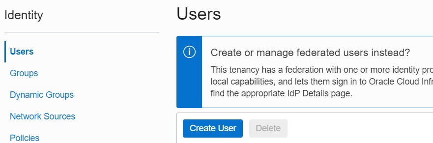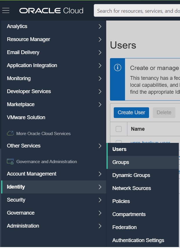 Now we need to create a user that we will use to authenticate our backup destination. Please go to the Users tab under the Identity tab in the menu on the left.
