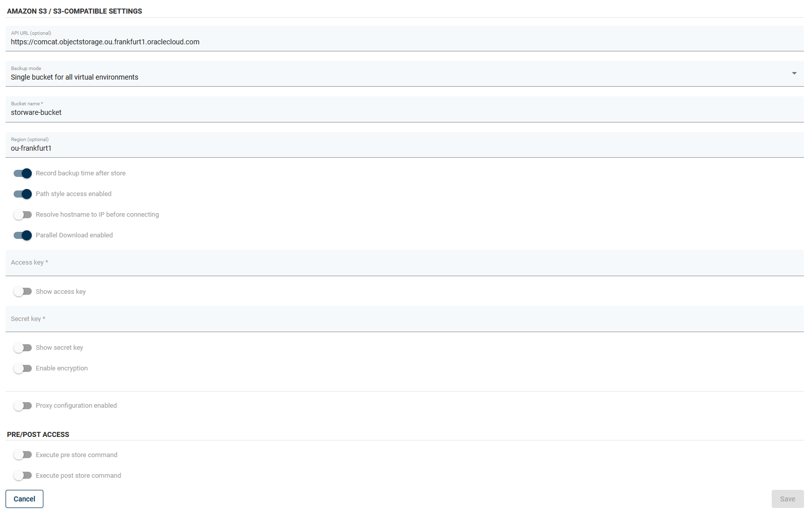 First, let's focus on the "S3-Compatible" section. To generate an API URL, you will need this site: https://docs.cloud.oracle.com/en-us/iaas/api/#/en/s3objectstorage/20160918/ As We mentioned earlier, you will need an object storage namespace (choose the API URL from the list according to your region). Then provide your bucket name and region, and finally switch on "Record time after backup" and "Path style access enabled". Configure the rest of the settings as desired.