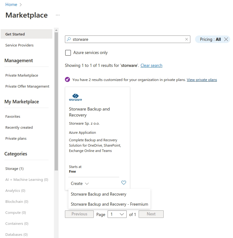 Using the search bar search for the Storware Backup and Recovery offer, click Create and choose your offer.