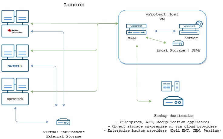 In this scenario, Storware Backup & Recovery (server and node) can, for example, be deployed as a VM using any of the installation methods.