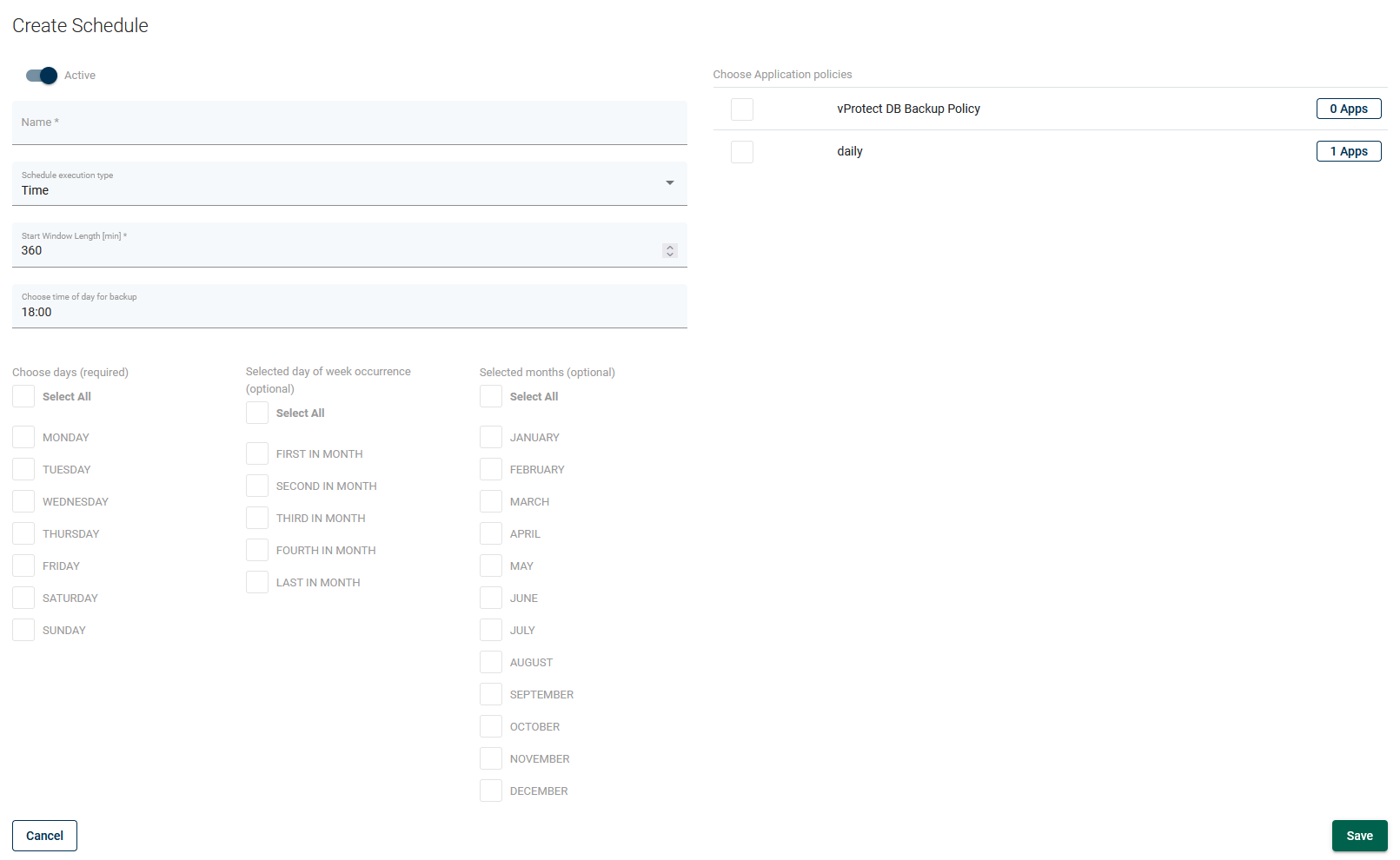 Create a new schedule for application policy - create it just like other schedules, enter a name, choose execution time (time or interval) and days of the week. *optionally you can select policy if already exists