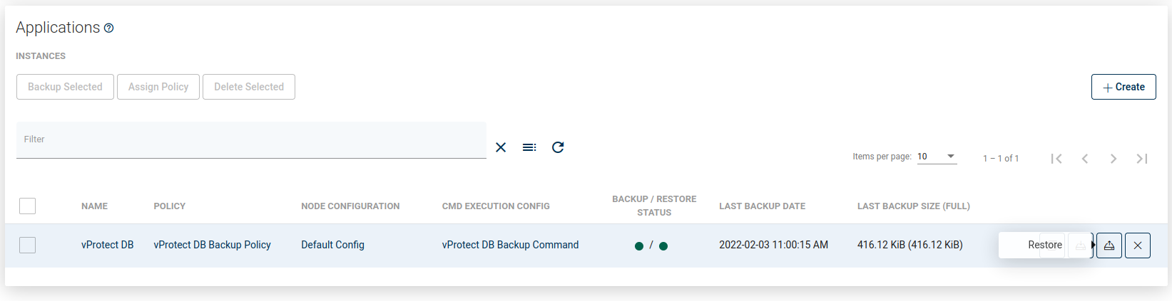 To perform an on-demand application restore, click the restore button on the right side of the application line.
