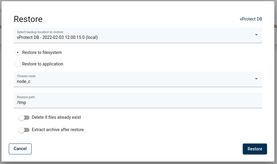 If you choose the "Restore to filesystem" option, you can select things such as which backup you want to restore, on which node you want to restore files, etc.