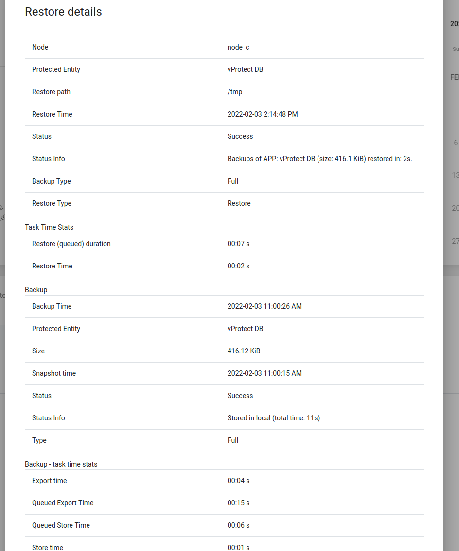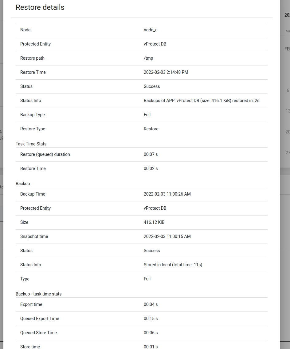 The calendar extends the possibilities of adjacent statistics. It allows you to neatly define the range of days you want to see, and additionally makes a quick summary of the number of backups and restores (top right corner). Blue - the sum of all backups, Green - the sum of successes, Red - the sum of failures.