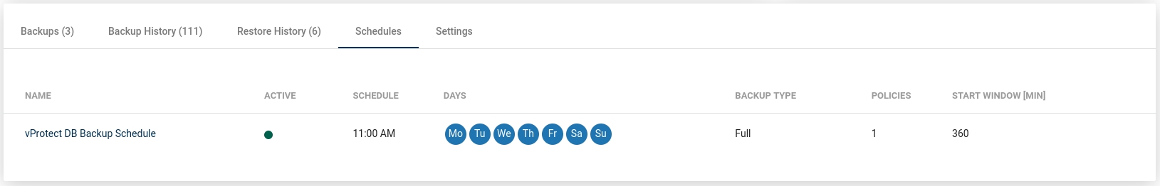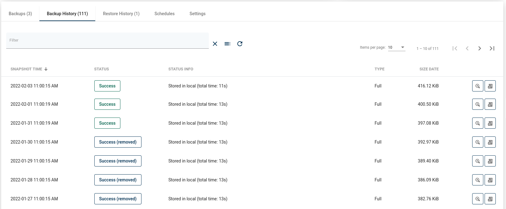 This tab shows information about all backups made for this application, including those failed, removed (because of retention), or currently executing.