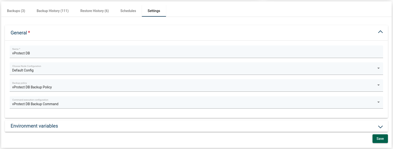 Finally, the last tab. The first two options allow you to change the node selected to perform backups and policies assigned to the application. The third allows you to choose the execution configuration.