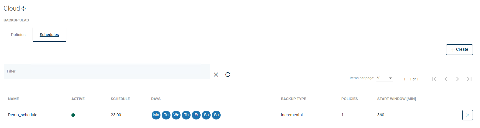 A schedule defines when and on which days cloud instances should be backup. To define a new schedule, open Backup SLAs under the Cloud section and go to the Schedules tab, then use the