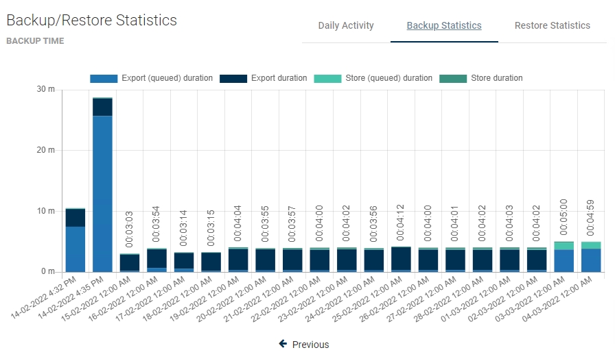 First, you'll see a daily summary of the backup and restore operations for the last month. This view is called "Daily Summary" and is the default view. You can switch the report between four views.