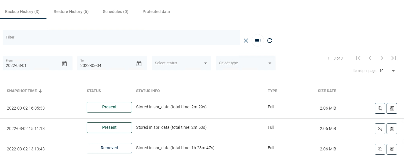 This tab shows information about all backups made, as well as information about failed, removed (because of retention), or currently executing backups.