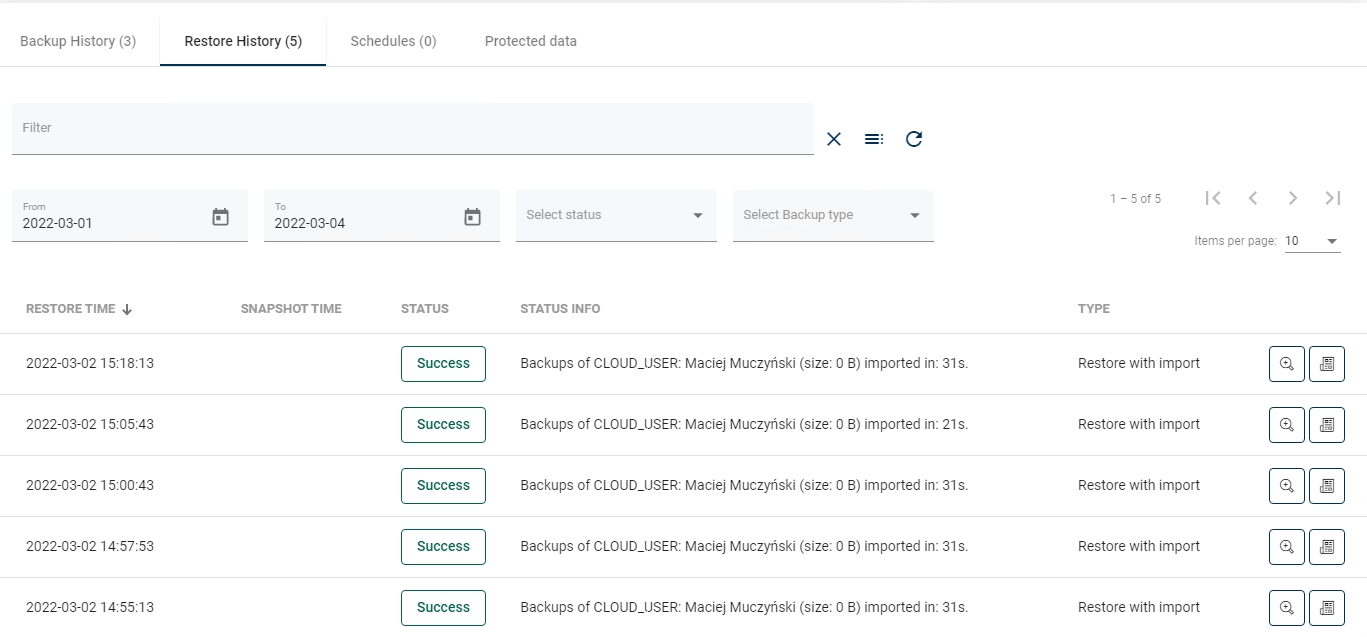 This tab is similar to "Backup History". This is a list with basic information about restores performed. When you open the details of the selected restore, you will see more detailed information.