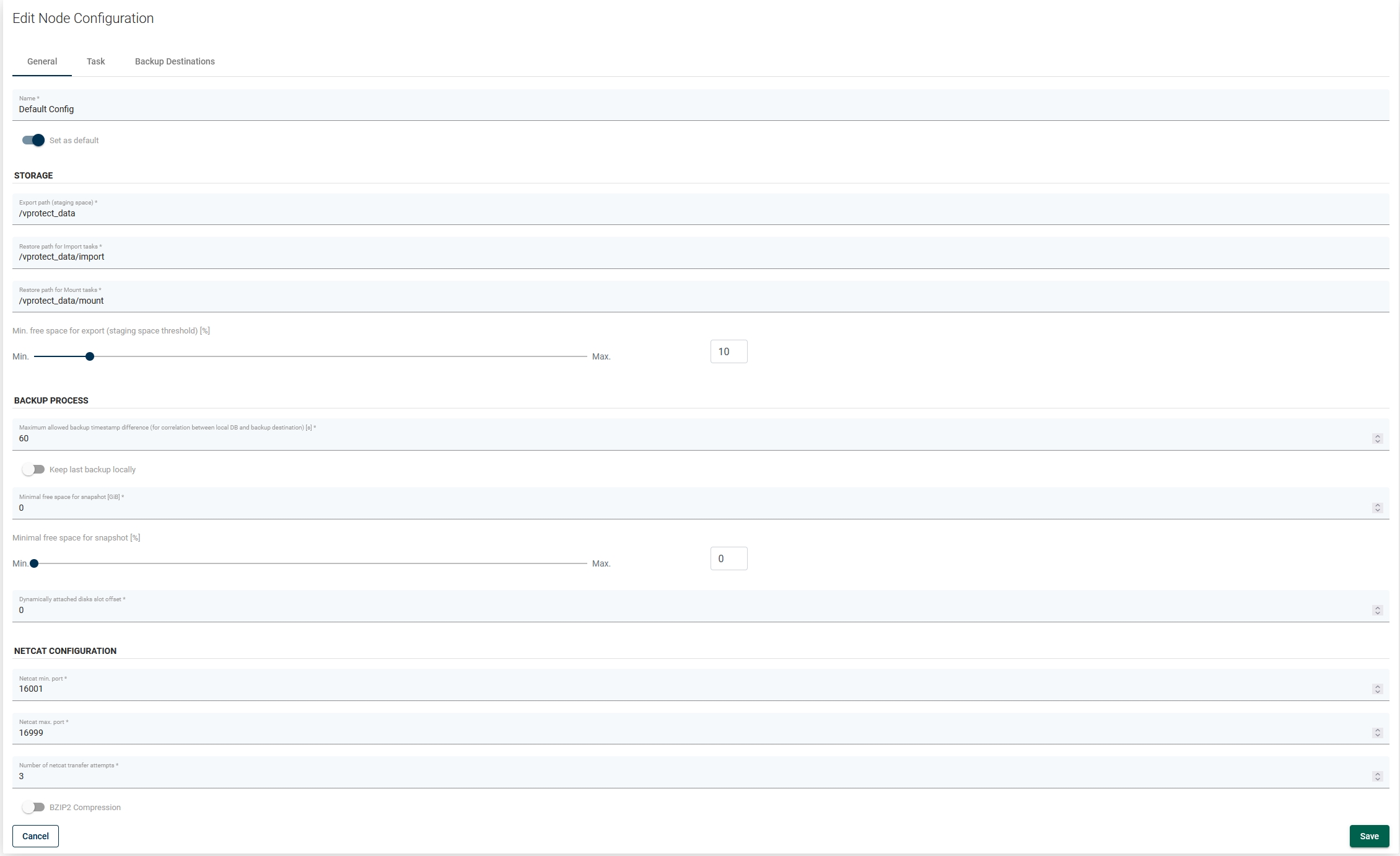 Max. allowed backup timestamp difference [s]- maximum time difference between the timestamp of a backup in Storware Backup & Recovery and the backup destination in order to match the local version of the backup with the remote oneMinimal free space for snapshot [GB]- the amount of storage space left in order to force a node to wait before starting another taskMinimal free space for snapshot [%]- the amount of storage space left in order to force a node to wait before starting another taskDynamically attached disks slot offset- this setting forces a shift of a disk slot number that the node reads/writes from when the disk-attachment method is used - currently used in the Nutanix disk-attachment method when you have block devices not reported by the hypervisor API, such as iSCSI mounted block devices. When set to 0, Storware Backup & Recovery will mount drives just after the last occupied (and reported by the hypervisor API) slot (which means that block device number 3 in API will be /dev/sdc in OS). In general, N means that Storware Backup & Recovery will shift N slots, so 1 will make the 3rd device be treated as the 4th in OS /dev/sdd)Netcat min. port- min. Netcat port rangeNetcat max. port- max. Netcat port rangeNumber of netcat transfer attempts- maximum number of attemptsBZIP2 Compression- compress backup files with bzip2
