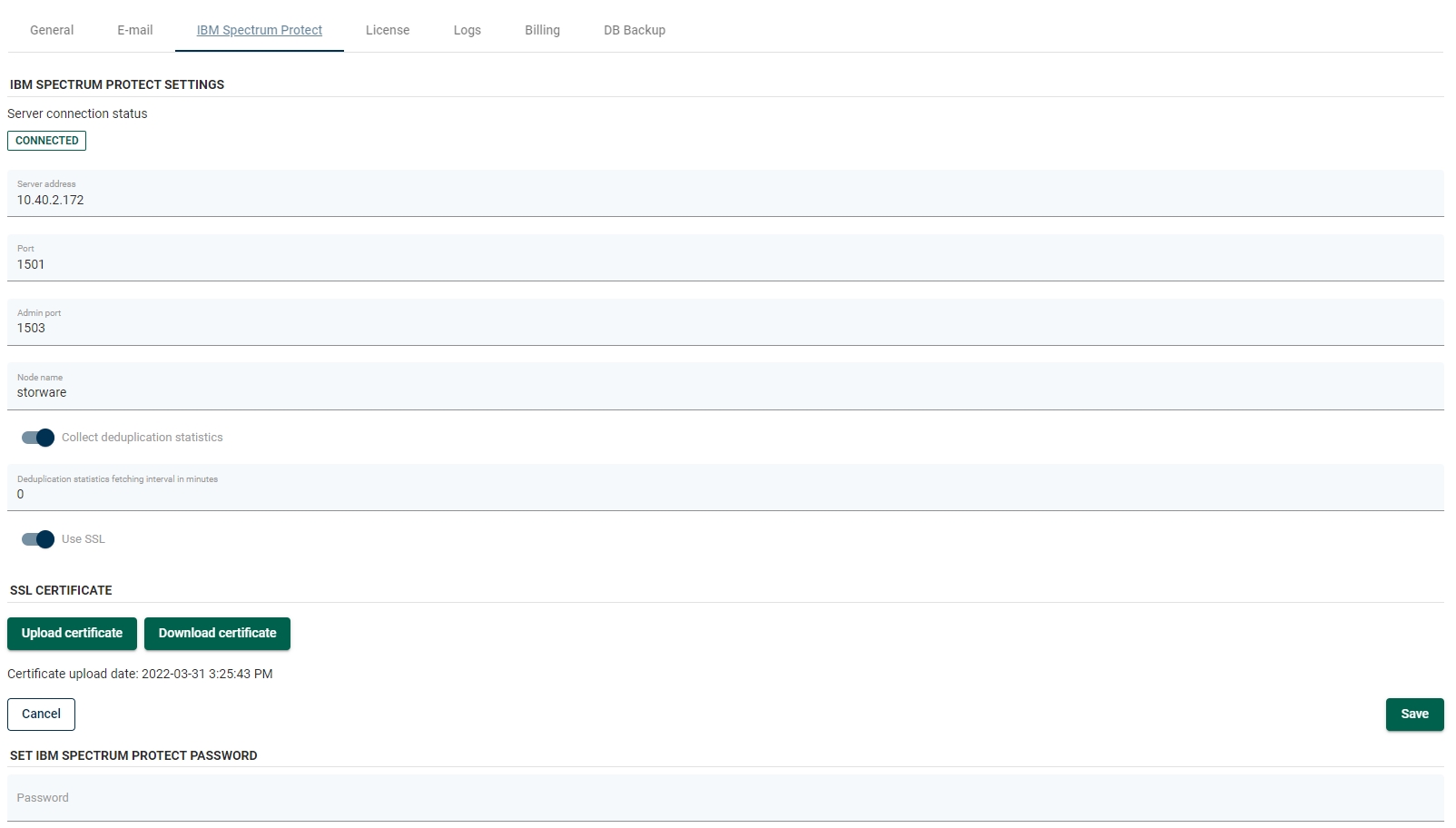 To use the SSL connection between Endpoint Server, desktop clients, and IBM Spectrum Protect server, you have to upload the correct SP certificate. This certificate will be used by the server, and also will be distributed to all Storware Endpoints clients and used with the SSL connection between the client and the backup server.