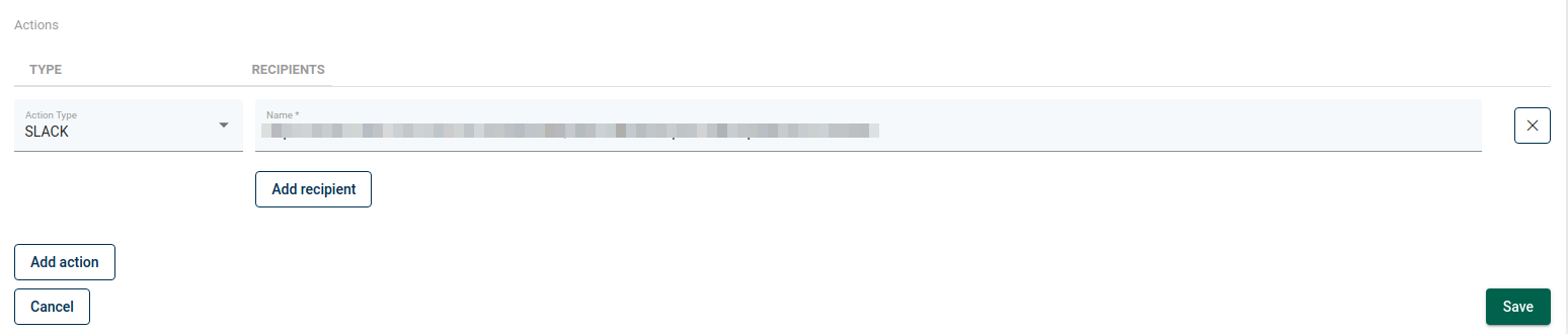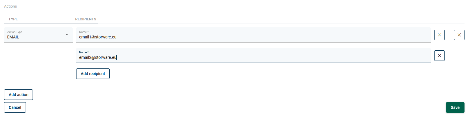 The last step is to add an action with related recipients. Click Add Action button, choose Action Type from a list, add one or more recipients passing their email addresses.