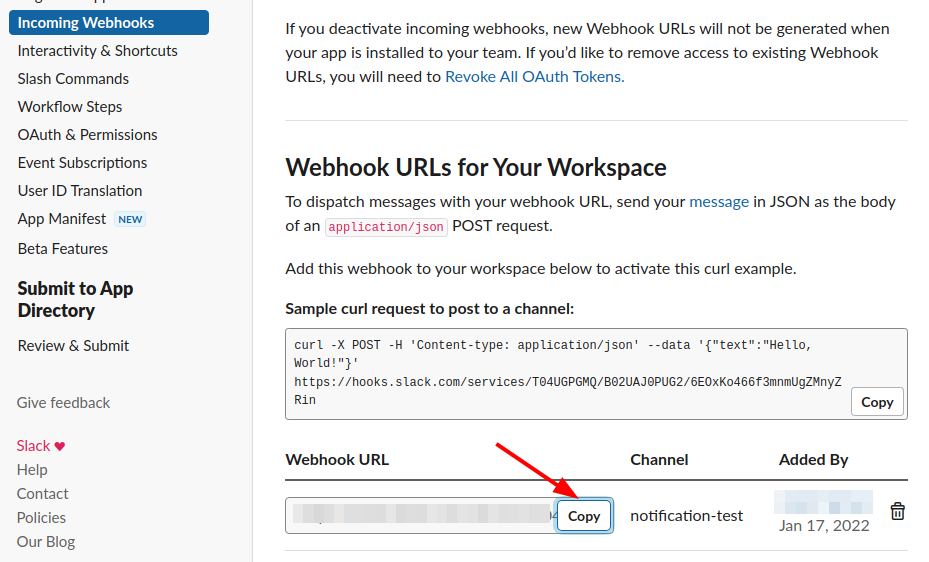 4. Copy the Webhook URL and use its Notification rules. Select Action Type as SLACK and paste the URL in the Name field.