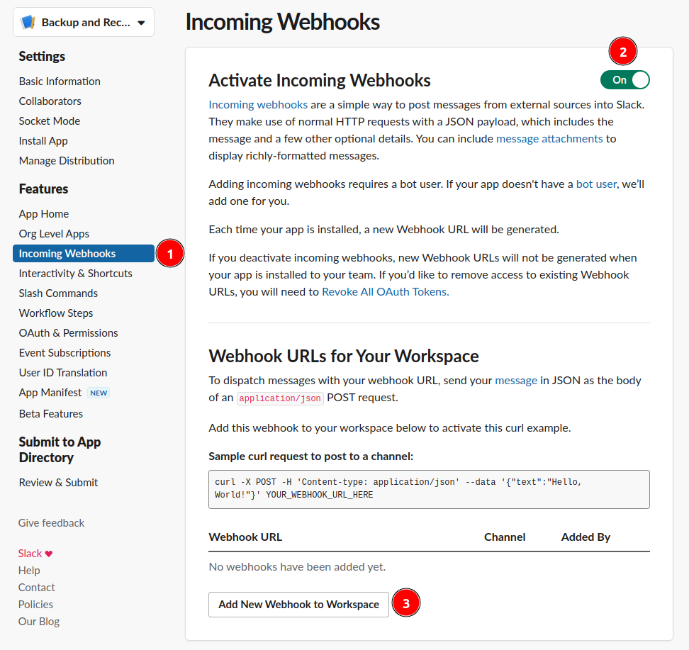 2. From the Features page, toggle Activate Incoming Webhooks on. Click Add New Webhook to Workspace.