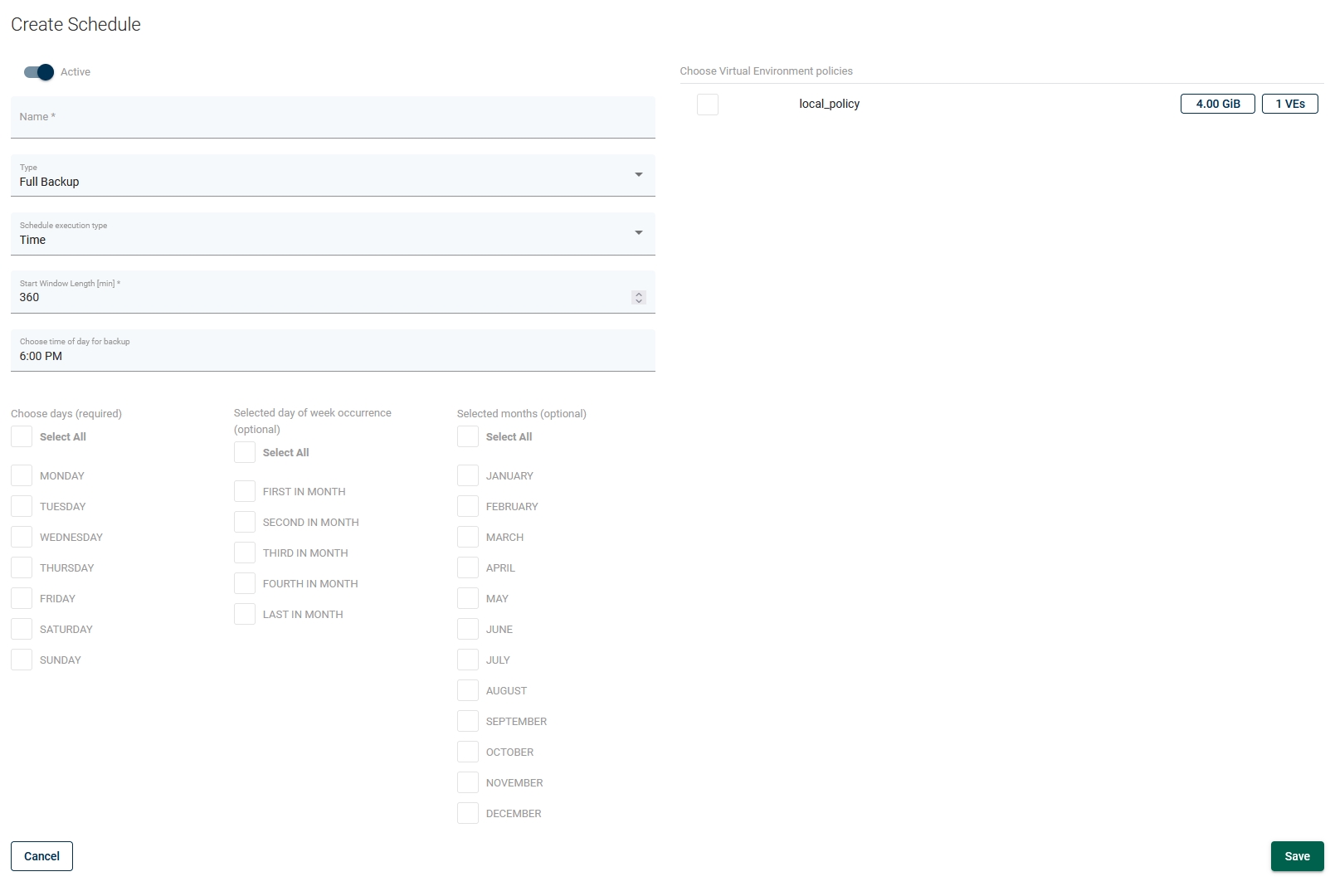 Schedule Active- enable or disable executing scheduleName- schedule nameBackup Type- defines the backup type: full or incrementalExecution Type- choose the time or interval modeStart Window- defines for how long since the task start time scheduled tasks are allowed to be executedChoose time of day- for the time execution mode, this defines when the task should be added to the queueChoose time of interval start- for the interval execution mode, this defines when tasks should startChoose time of interval end- for the interval execution mode, this defines when tasks should endFrequency- defines how often the task will be executed during the intervalChoose days- the last required parameter, select the days of the week on which the task will be performed