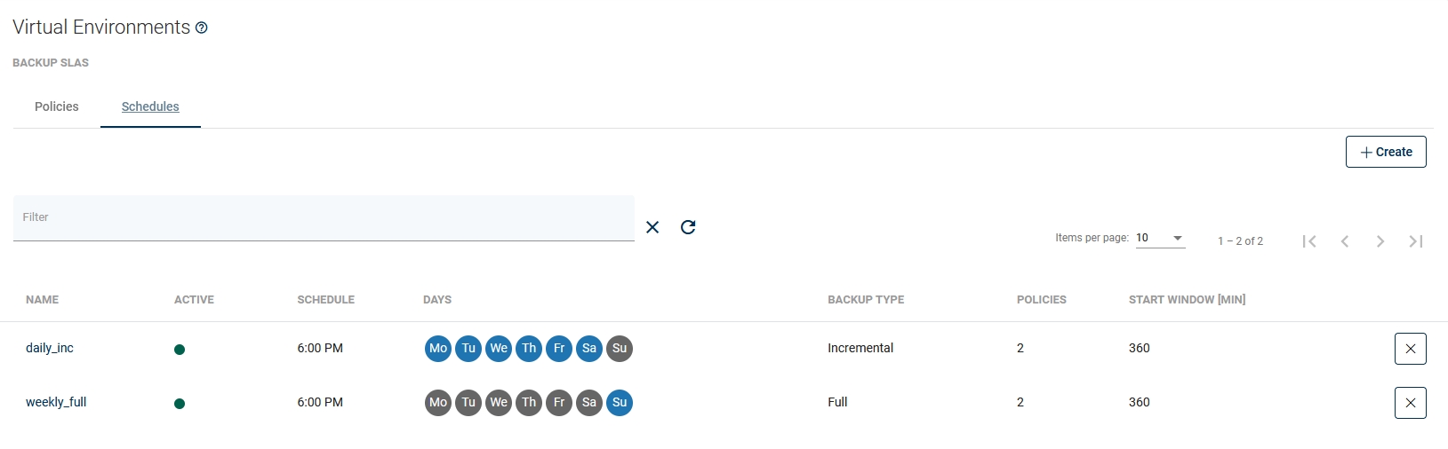 A schedule defines when and on which days VMs should be backup. To define a new schedule, open Backup SLAs under the Virtual Environments section and go to the Schedules tab, then use the
