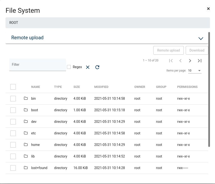 VIRTUAL MACHINE- mounted virtual machine nameMODE- Auto - Storware Backup & Recovery auto-detect filesystems and mount it on path "/mnt/vprotect/". In Manual mode, the user chose a mount point for selected filesystems.NODE- Storware Backup & Recovery node responsible for mount job.SNAPSHOT DATE- date of mounted backup of the VM.FILE SYSTEMS- a number of mounted filesystems.FILES- a number of mounted virtual disk images.