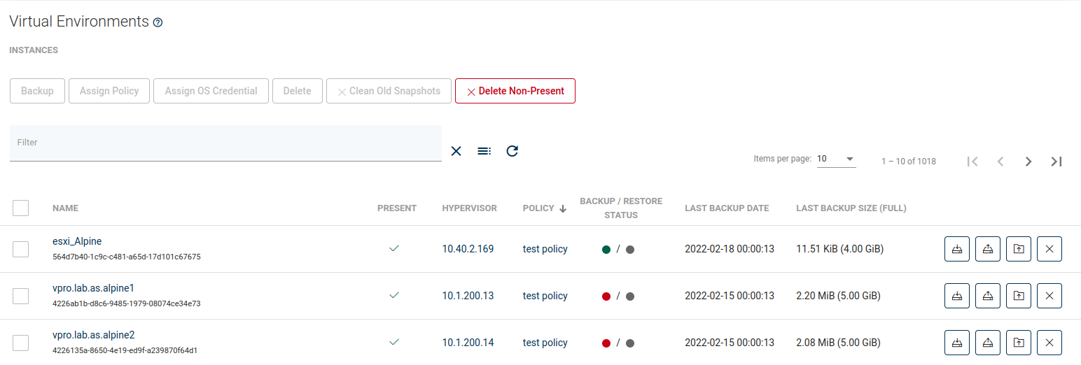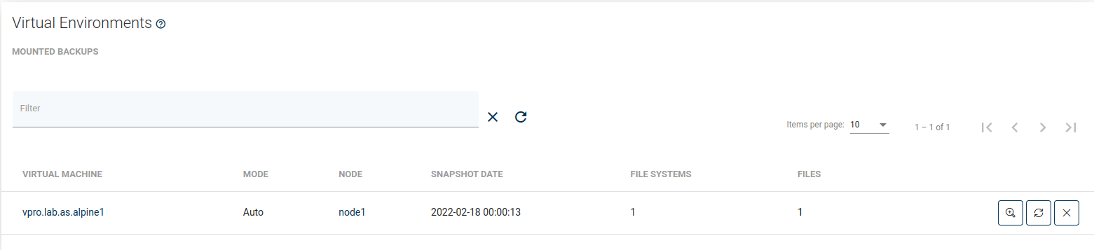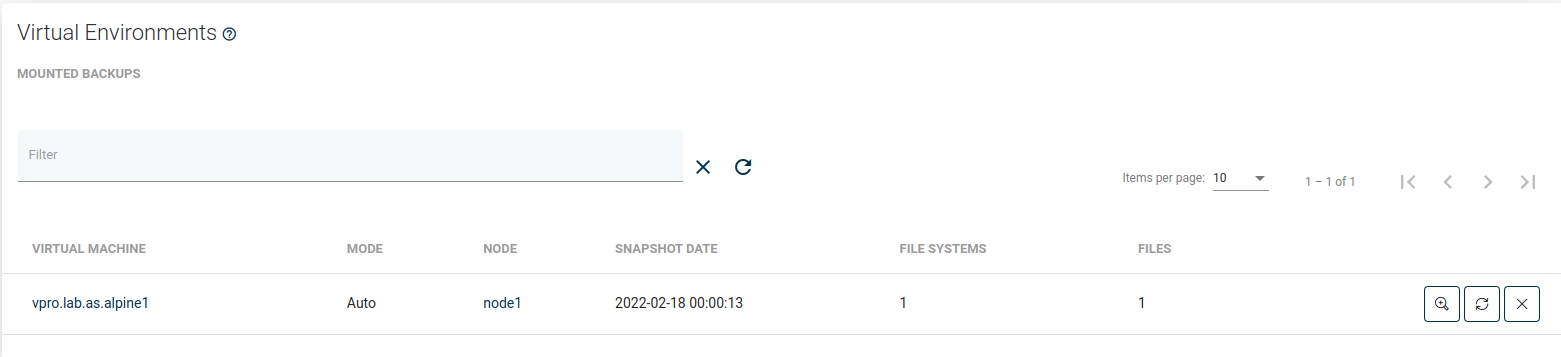 To mount backup go to the Instances tab under Virtual Environment section on the left side menu, then click on the mount icon next to a chosen virtual machine ![]()