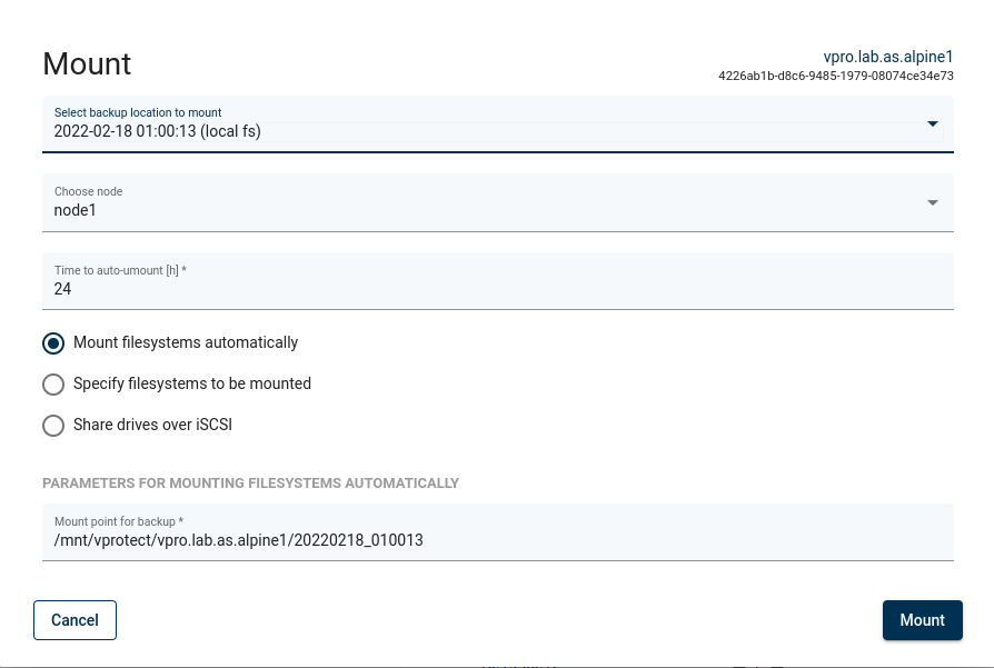 On the popup window, you can select which backup you want to mount and on which node. You can also change the mounting method, but we recommend leaving the default setting "Mount filesystem automatically".