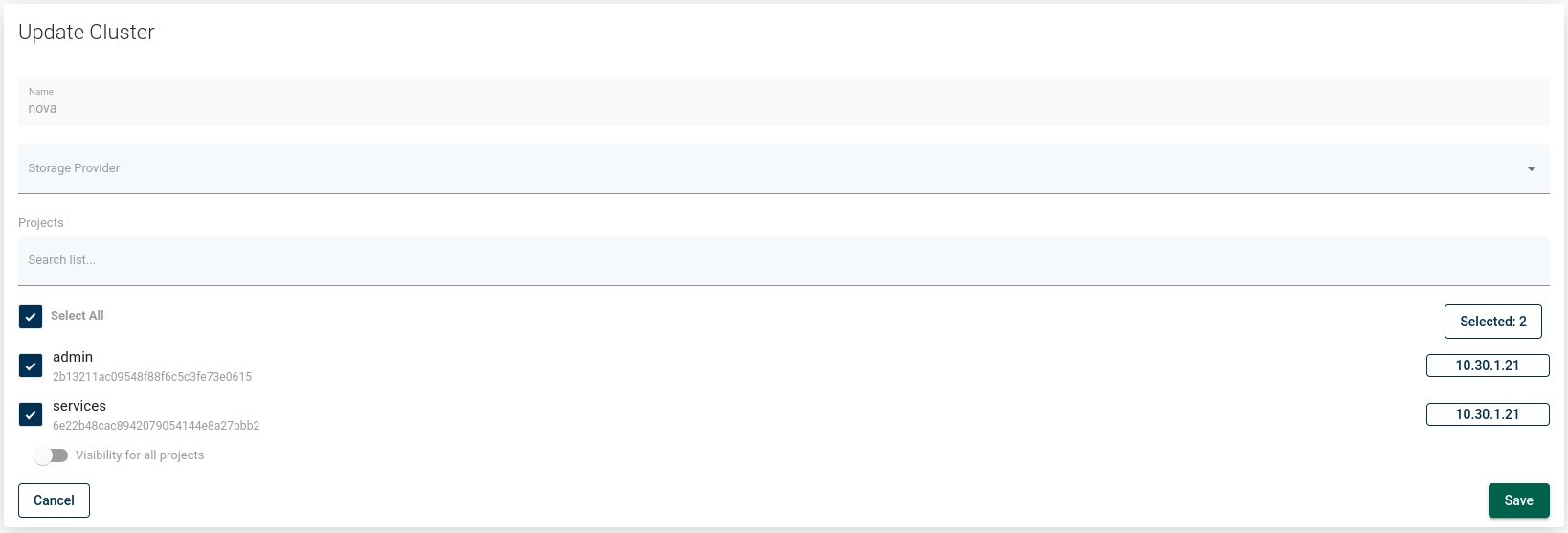 Selecting "Visible for all projects" will make a cluster/storage visible for all projects, regardless of their time of creation (including ones added after editing this setting).