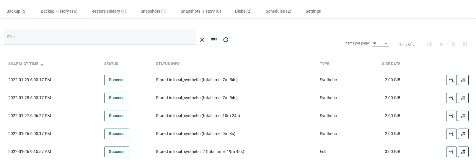 This tab shows information about all backups made for this virtual machine, as well as information about failed, removed (because of retention), or currently executing backups.