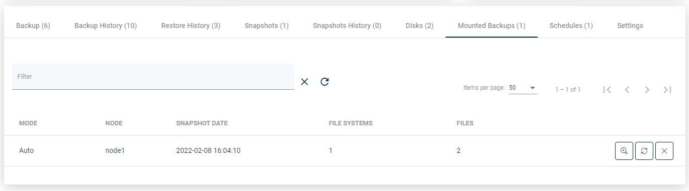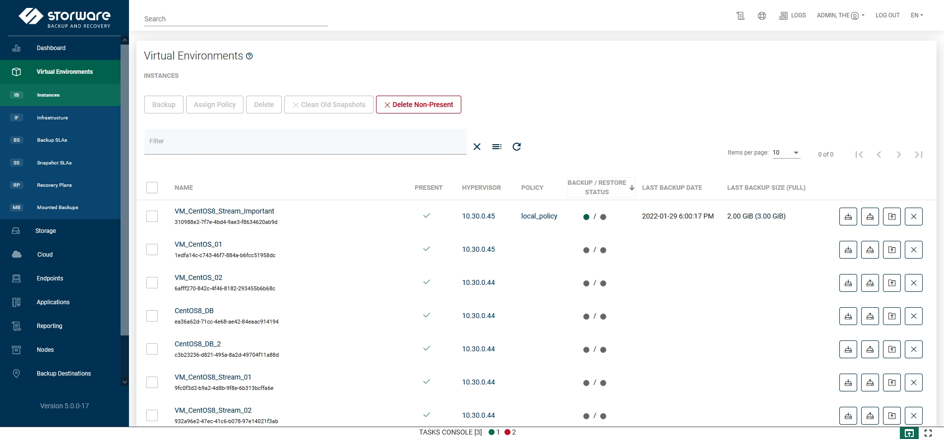 A list of currently known virtual machines and access to the details page of each object. From this place, you can also perform on-demand actions such as backup, restore, and file-level restore.