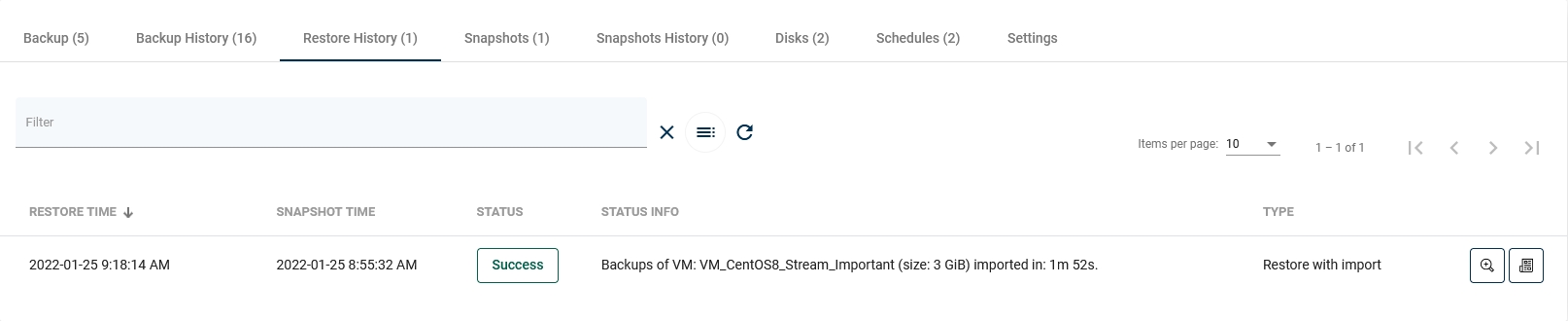 This tab is similar to "Backup History". This is a list with basic information about the virtual machine restores performed. When you open the details of the selected restore, you will see more detailed information.