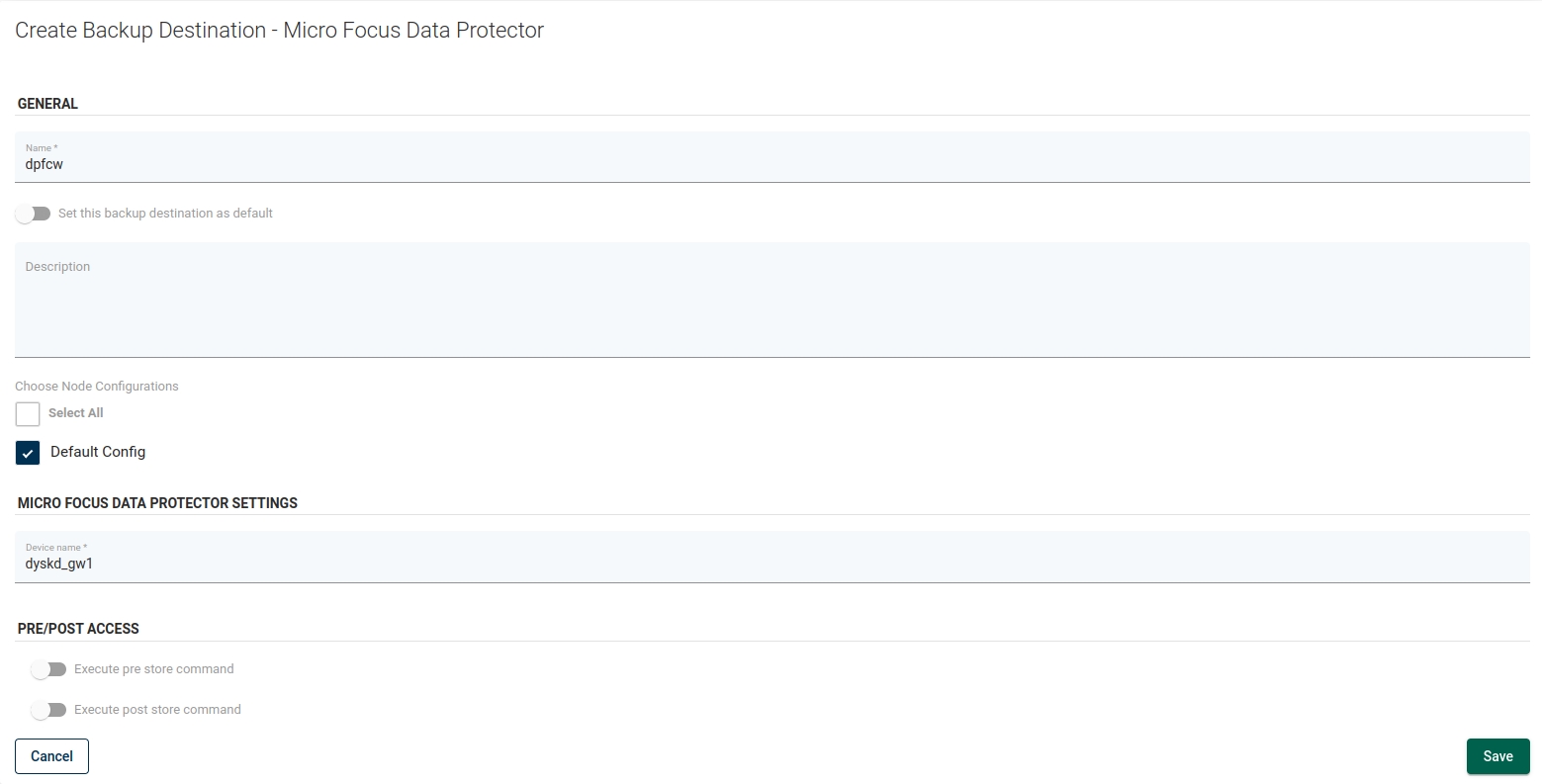 =======================================================================================================================================================================Next, go to Storware Backup & Recovery and go to Backup Destinations -> Enterprise. Clik Create Backup destination and choose Micro Focus Data Protector. Type the name for new backup destination and provide Device name which you get from first step.