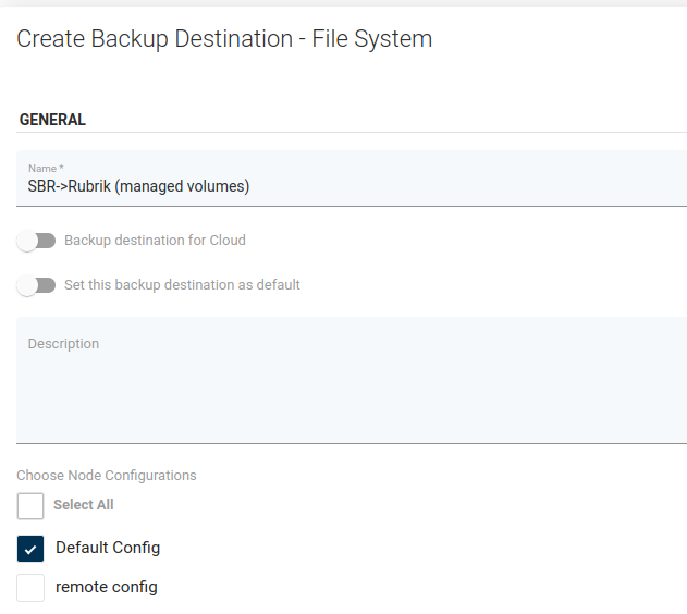 Go to section on the left menu: Backup Destinations -> File System, and we need to create new Backup Destination – on the right click on button Create Backup Destination, choose File System: