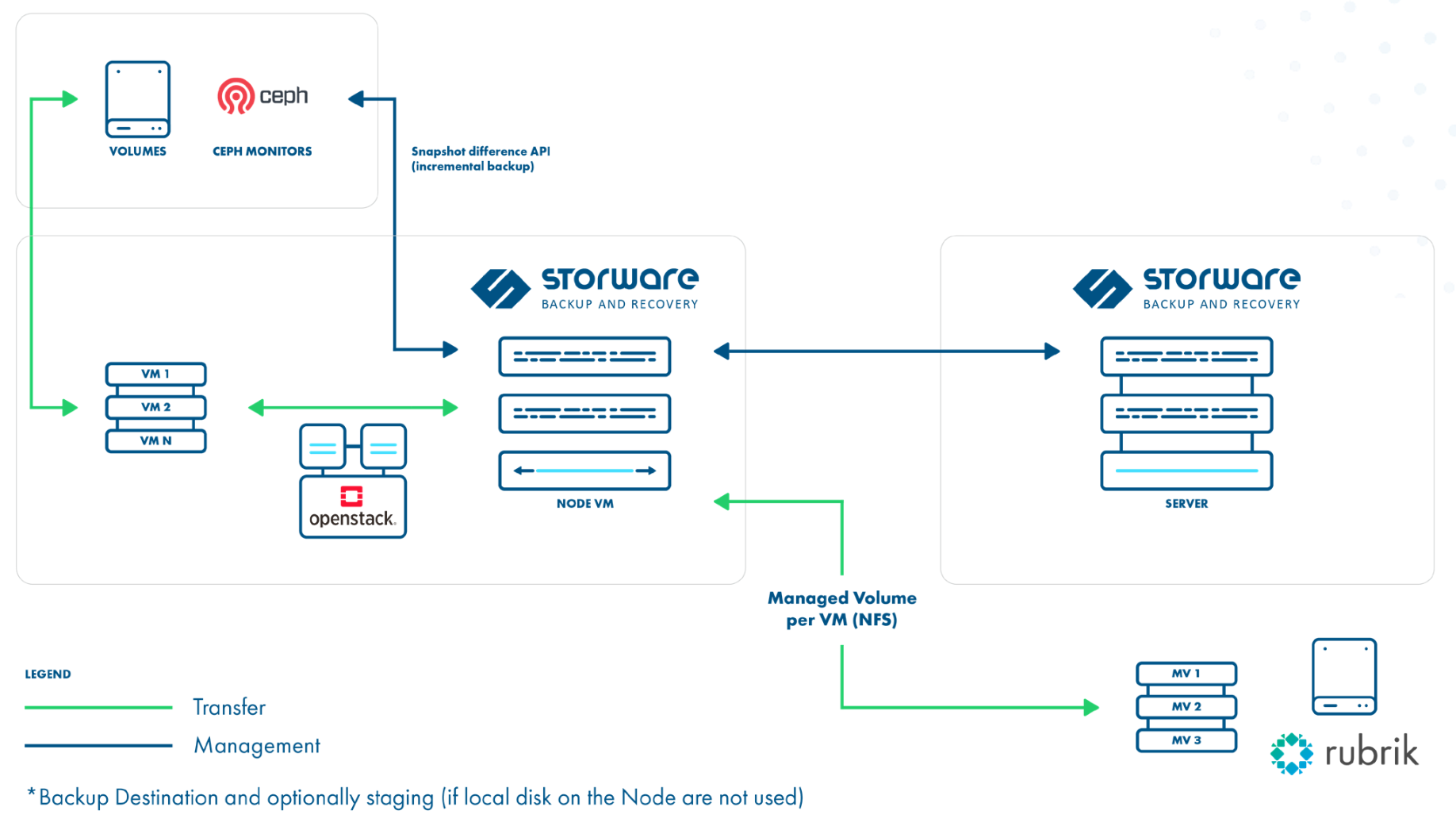 With Stoware supporting a wide range of sources one can easily expand Rubrik capabilities by integrating both solutions. Storware supports file-based backup destinations with mechanism to run custom pre/post storage access integration scripts. Rubrik on the other hand is able to expose Managed Volumes which can easily be used as snapshot-driven file system backup destination. Storware initiates backups for all supported virtualization platforms or storage providers. File system backup destination has enabled pre/post storage access integration scripts which are executed in each storage-related activity (before and after changes are made). For each VM/storage instance integration assumes a separate managed volume.