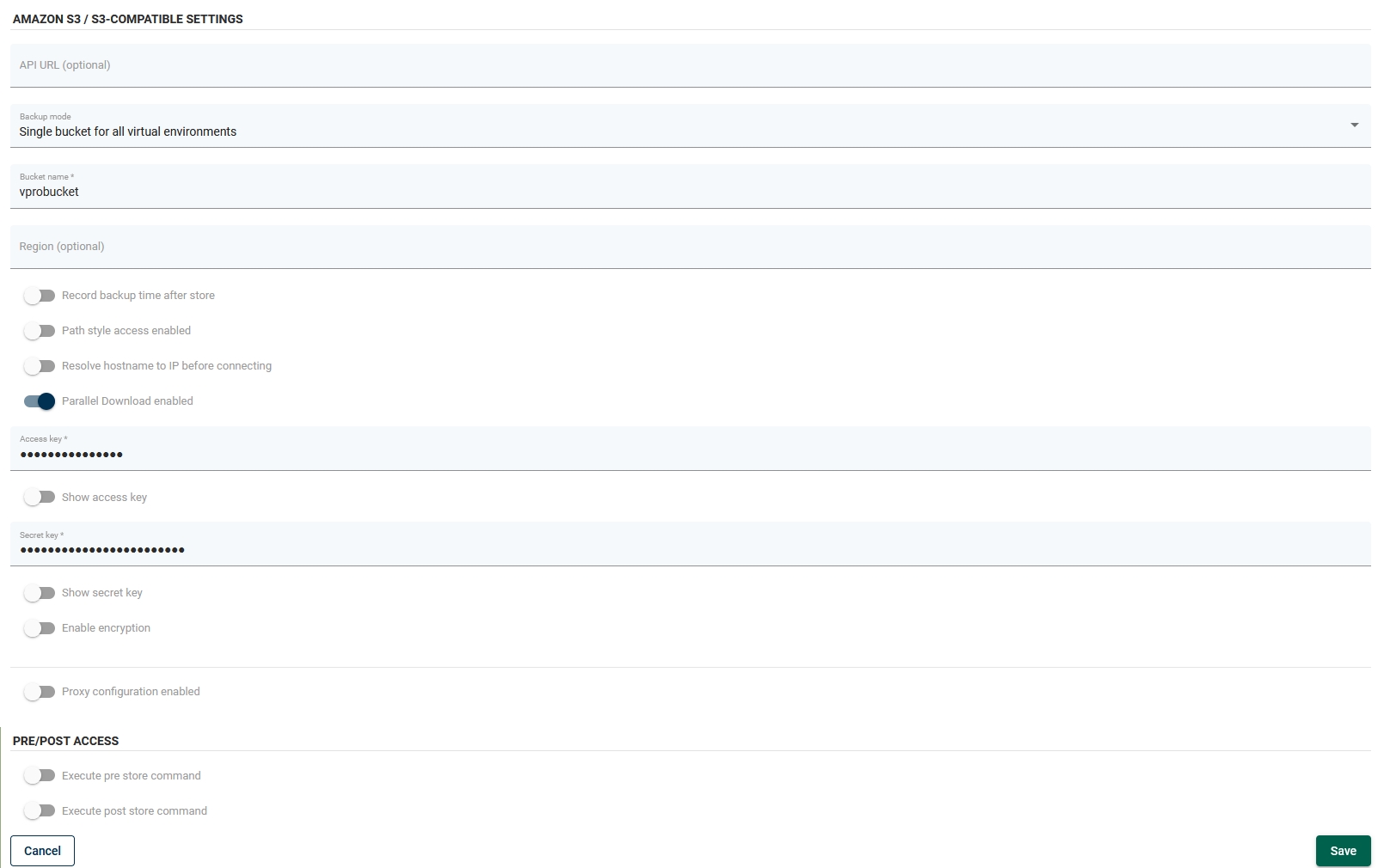 Now go to the Backup destination tab on the Storware Backup & Recovery dashboard and change the sub-tab to object storage. Provide the bucket name and key credentials, and then configure the remaining options according to your requirements: