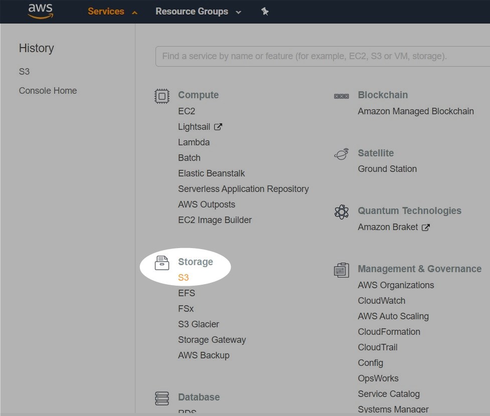 Now we will show you how to quickly create S3 storage and integrate it with Storware Backup & Recovery as a backup destination. After logging in, expand the services tab a choose S3 under the Storage section: