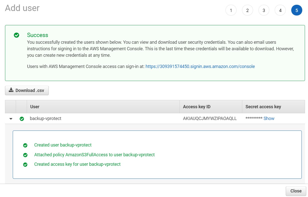 Remember to download the .csv or copy the key credentials manually: