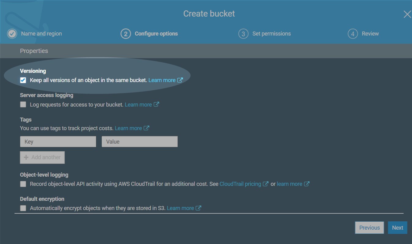 In "Configure options" activate versioning: (In all other tabs, you can leave the default settings)