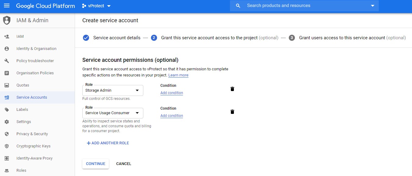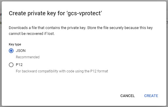 Generate a service account key: Click here for more info about Creating service account keys. The service account key should have the Role set to Storage Admin and Service Usage Consumer.