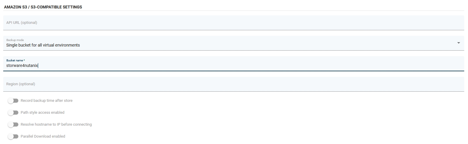 Then go to the AMAZON S3/S3-COMPATIBLE SETTINGS the segment in which you should deselect the Parallel Download enabled option for Nutanix Objects.
