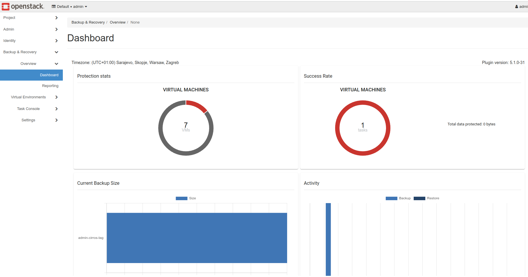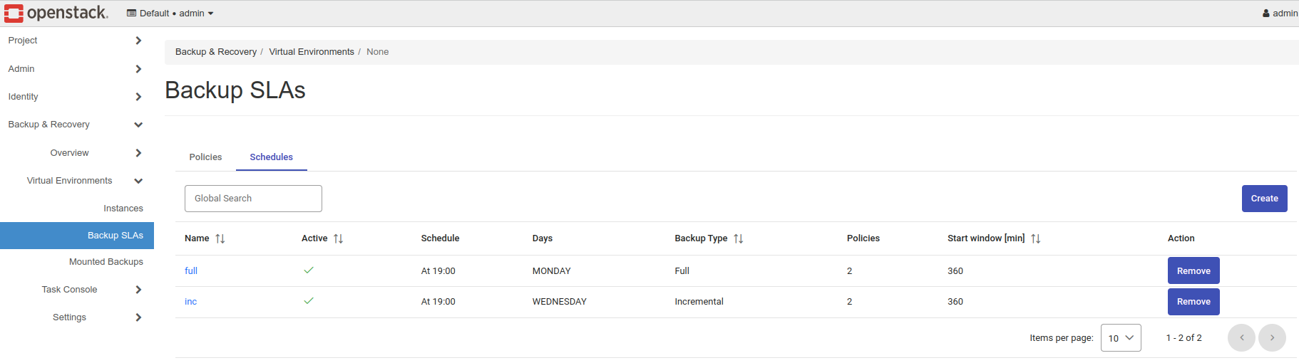 After installation (which is described at the end of this article) you will see a new tab "Backup & Recovery" in the OpenStack menu. This consists of several sub-tabs that allow you to perform basic actions such as backup, restore or create a new schedule.