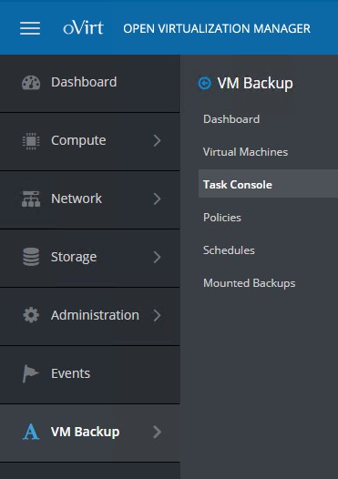 After installation (which is described at the end of this article) you will see a new tab "VM Backups" in the oVirt menu.