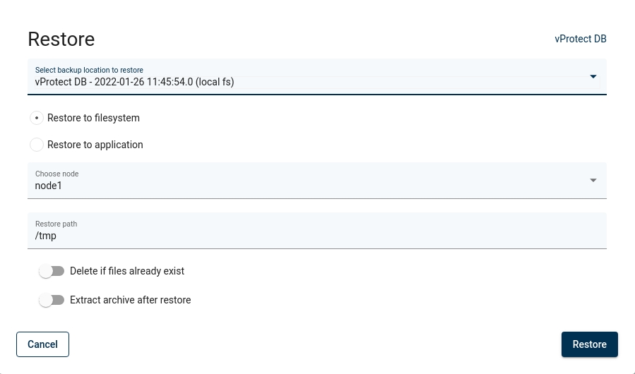 2. In the next window, choose if you want to restore to the file system or to the application instance host. Enter the rest parameters according to your needs and click Restore button.