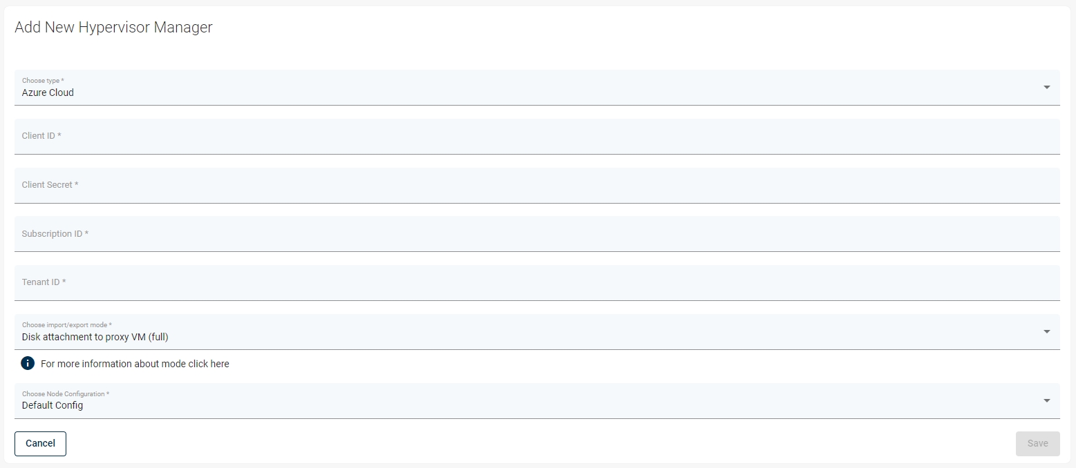 To properly configure your Azure Cloud account, go to Storware Backup & Recovery WebUI -> Virtual Environments -> Infrastructure -> Hypervisor Managers and click create button.