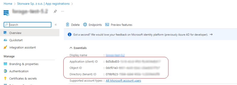 Storware Backup & Recovery Node requires the Application (client) ID, Client Secret, Subscription ID and Tenant ID to connect to the Microsoft Azure account.