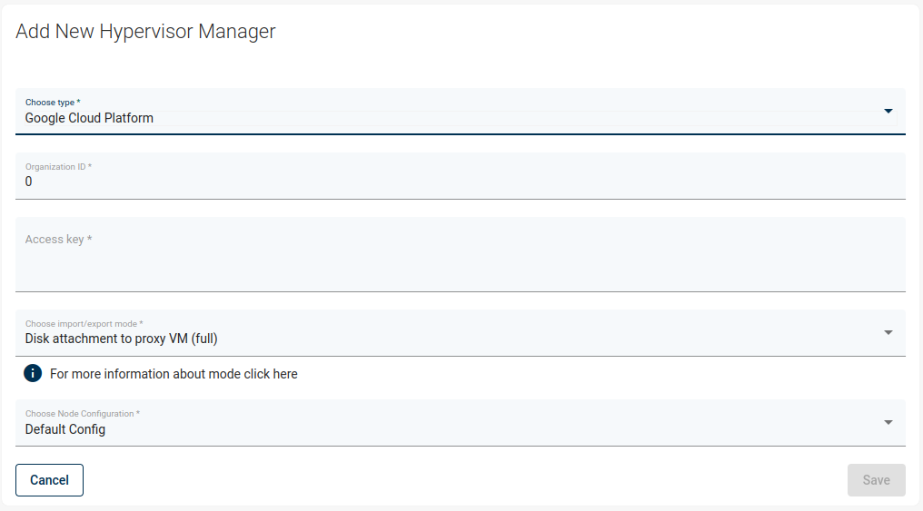 To properly configure your GCP account, go to Storware Backup & Recovery WebUI -> Virtual Environments -> Infrastructure -> add hypervisor manager