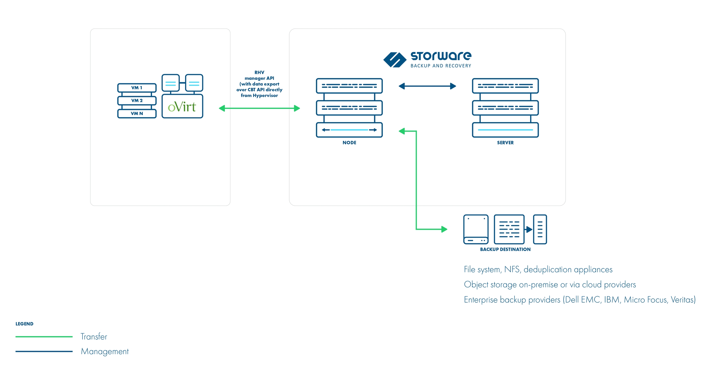 This is an enhancement for disk image transfer API strategy. It allows Storware Backup & Recovery to use oVirt API v4.2+ (HTTPS connection to oVirt manager) only to collect metadata. Backup is done over SSH directly from the hypervisor (optionally using netcat for transfer), import is also using SSH (without the netcat option). There is no need to install a node in the oVirt environment. This method can significantly boost backup transfers and supports incremental backups.