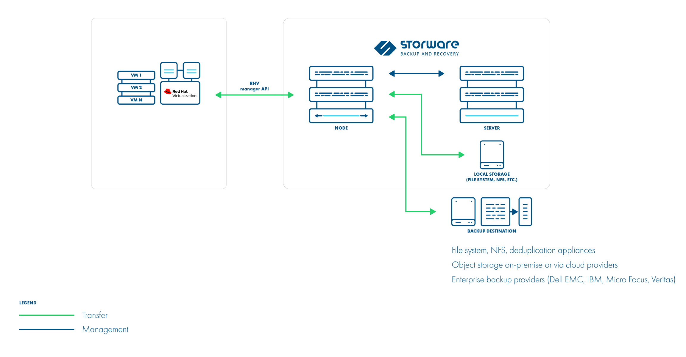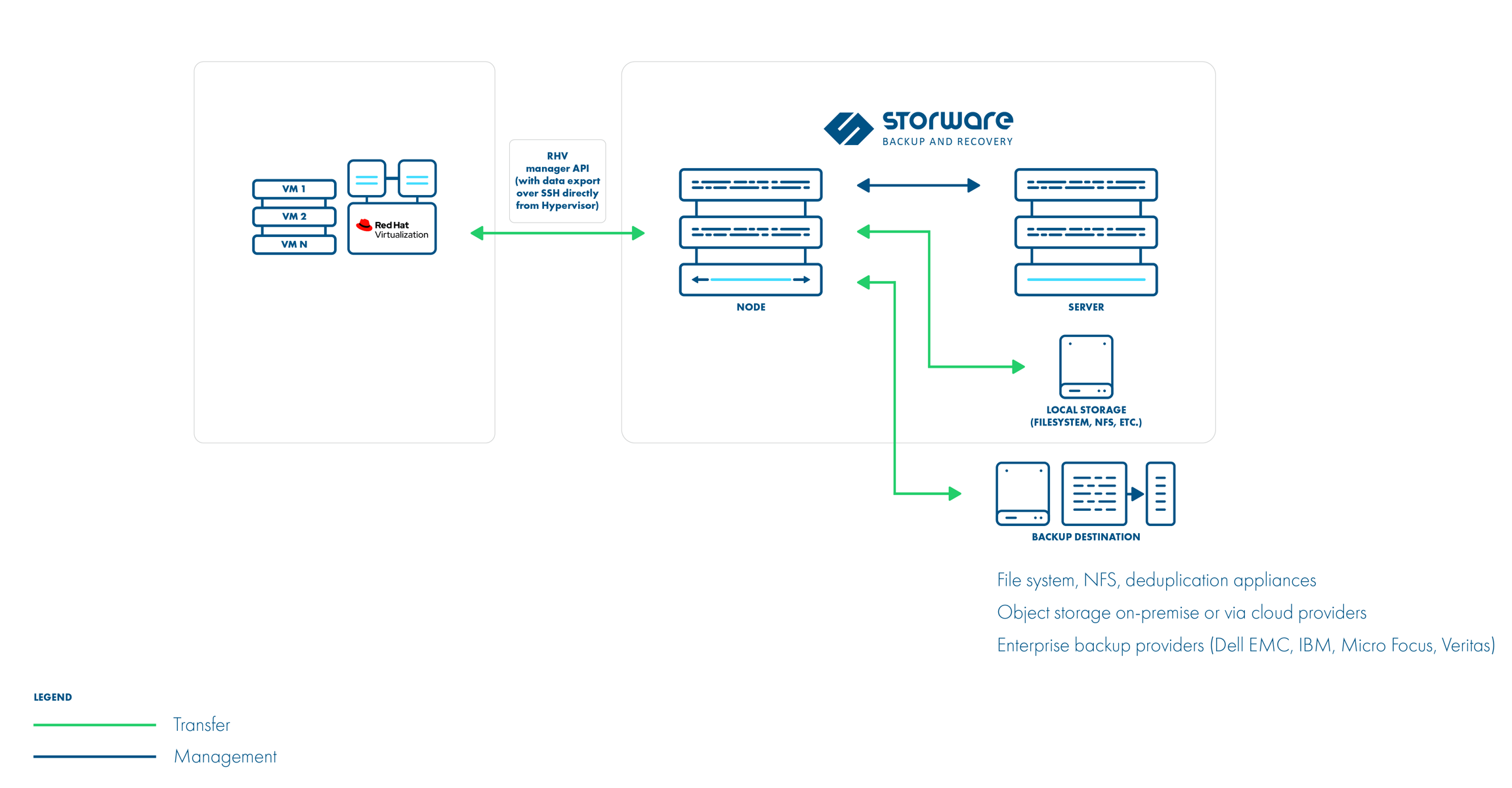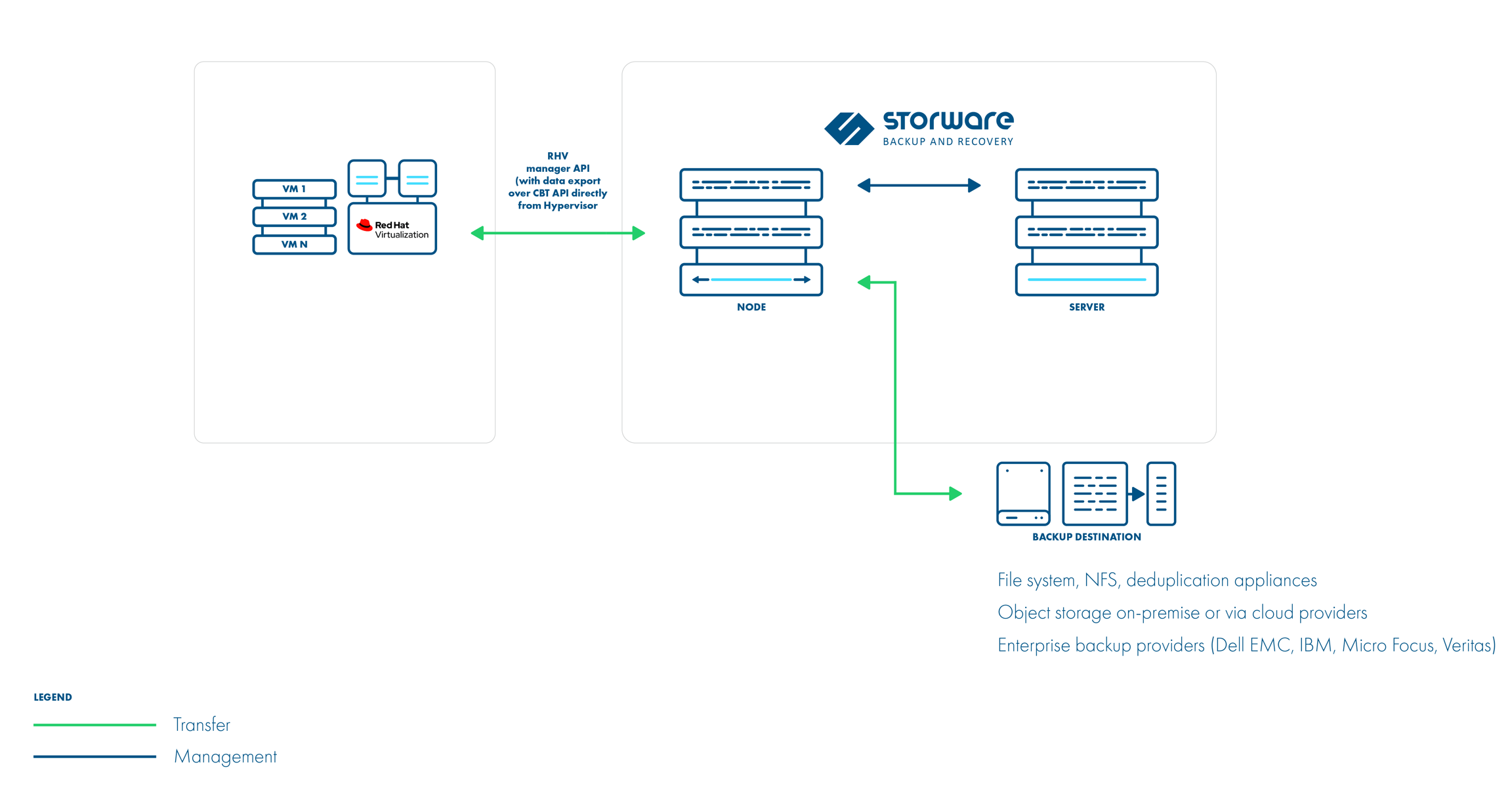 This is an enhancement for the disk image transfer API strategy. It allows Storware Backup & Recovery to use RHV API v4.2+ (HTTPS connection to RHV manager) only to collect metadata. Backup is done over SSH directly from the hypervisor (optionally using netcat for transfer), import is also using SSH (without netcat option). No need to install a node on the RHV environment. This method can boost backup transfers and supports incremental backups.