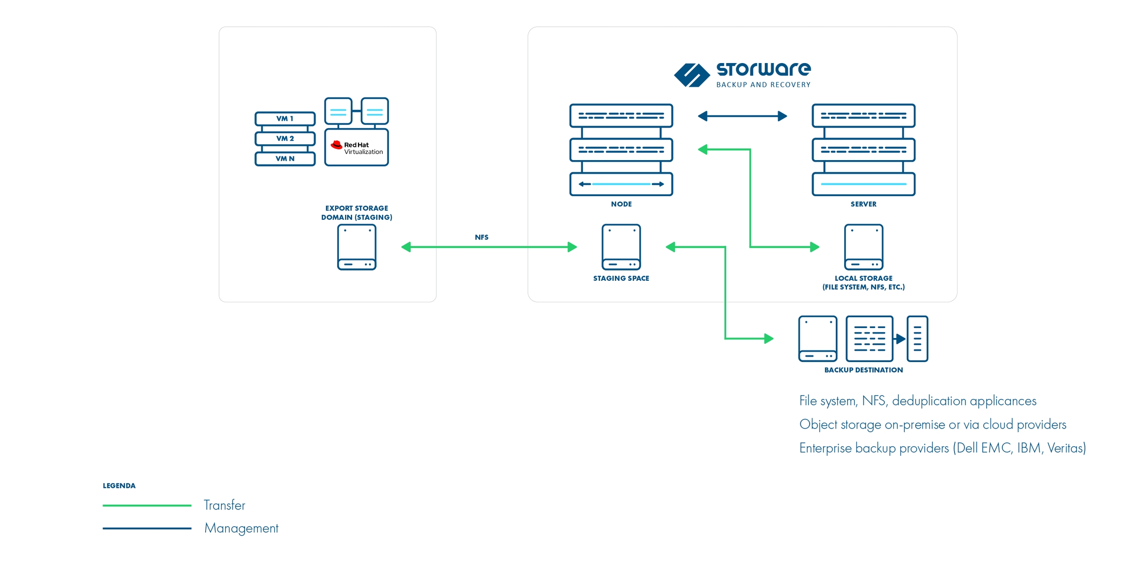 This setup requires you to create a storage domain used for VM export. The export storage domain should also be accessible by Storware Backup & Recovery Node in its staging directory. This implies that the storage space doesn't have to be exported by Storware Backup & Recovery Node - it can be mounted from an external source. The only requirement is to have it visible from both the RHV host and the Node itself. Keep in mind that ownership of the files on the share should allow both Storware Backup & Recovery and RHV to read and write files.