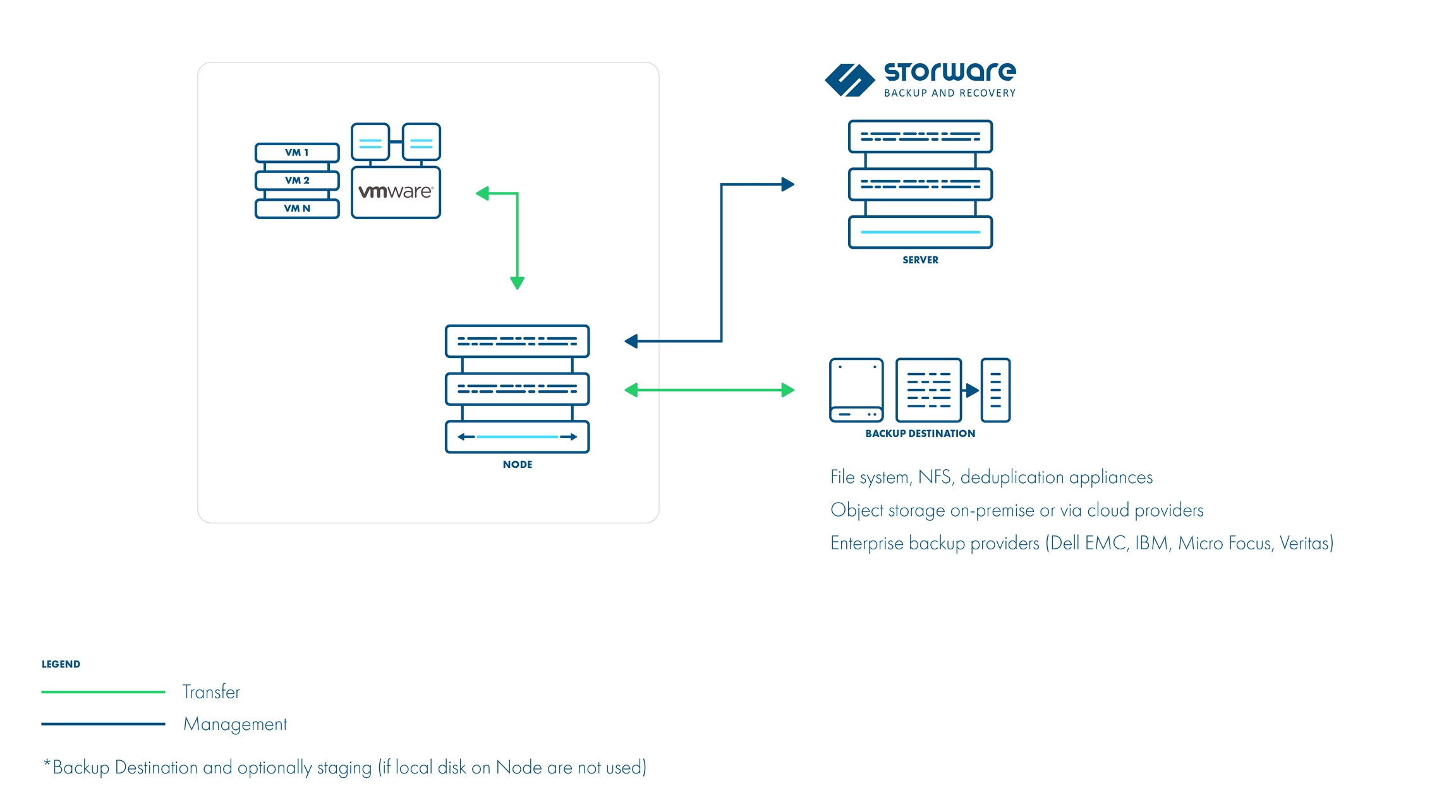 Storware supports agentless backup and recovery operations for VMware virtual machines through seamless integration with VMware vSphere, vCenter, and ESXi hosts.