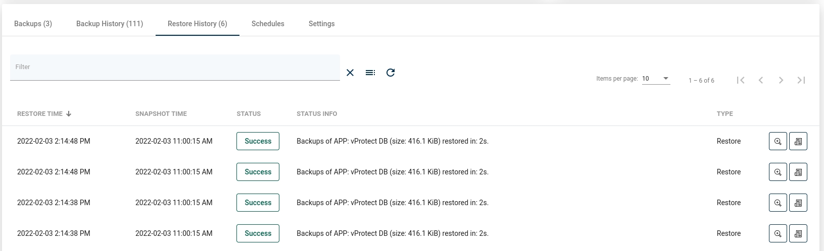This tab is similar to "Backup History". This is a list with basic information about the application restores performed. When you open the details of the selected restore, you will see much more detailed information.
