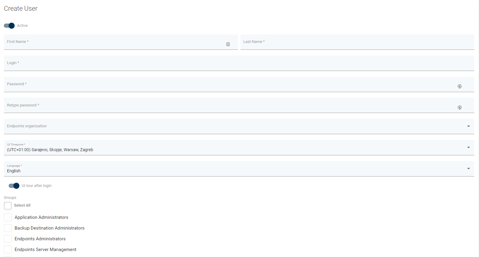 Provide proper: First Name, Last Name, Login and Password. Then in the Groups section choose Endpoints Administrator or Endpoints Server Management group.